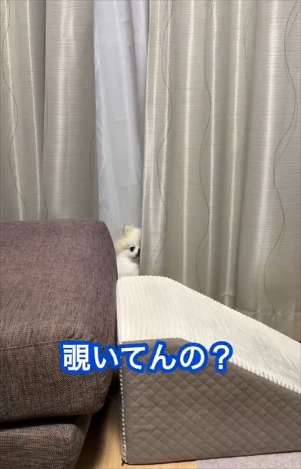 飼い主さんが「覗いているの?」と声をかけても、じっと動かないまま。 もしかしたら、まだ見つかっていないと思っているのかもしれません。