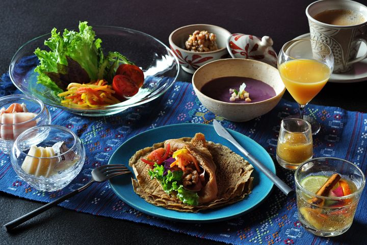 最後の朝食は「発酵朝食」。黒糖を練り込んで作られた、沖縄の伝統的な食事であるちんぴん」に、豚肉味噌を混ぜ合わせた「アンダンスー」やチーズ、野菜などをクレープのように巻いて食べる。ちんぴんのほんのりあまく香ばしい生地に、アンダンスーのあまじょっぱさがとても合う。一緒に紅芋のスープのほっこりしたやさしい甘さが美味しい。