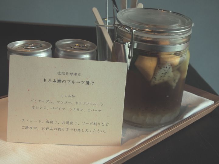 滞在中は、なんとオリジナルの発酵ドリンク飲み放題もろみ酢パイナップルドラゴンフルーツなど沖縄らしい果物を漬けた「もろみ酢のフルーツ漬け」を、水割りやストレートなど様々なレパートリーで楽しめる。酸味が強いイメージのもろみ酢でも、フルーツが漬けてあるからほんのり甘くて飲みやすい。
