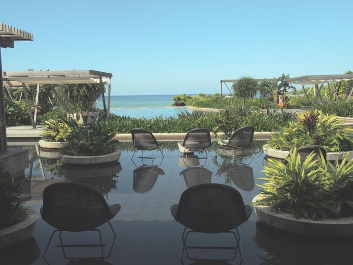 インフィニティプールは一年を通して快適な温度に保たれており、冬でも楽しめる。近くのフロントでは、シークヮーサージュースなどのフリードリンクを用意。有料でアルコールも注文できるので、ソファに腰を下ろしてゆったりとした時間を過ごすのも良い。