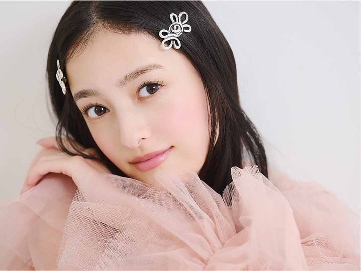 ピンクチュールトップス ¥9,900/LA BELLE ETUDE(アンティローザ)、カーキ花柄スパンコールパンツ ¥39,380/DREAM SISTER JANE(THE WALL SHOWROOM)、ヘアピン(2個セット)¥1,870/GOLDY、中に着たキャミソール/スタイリスト私物