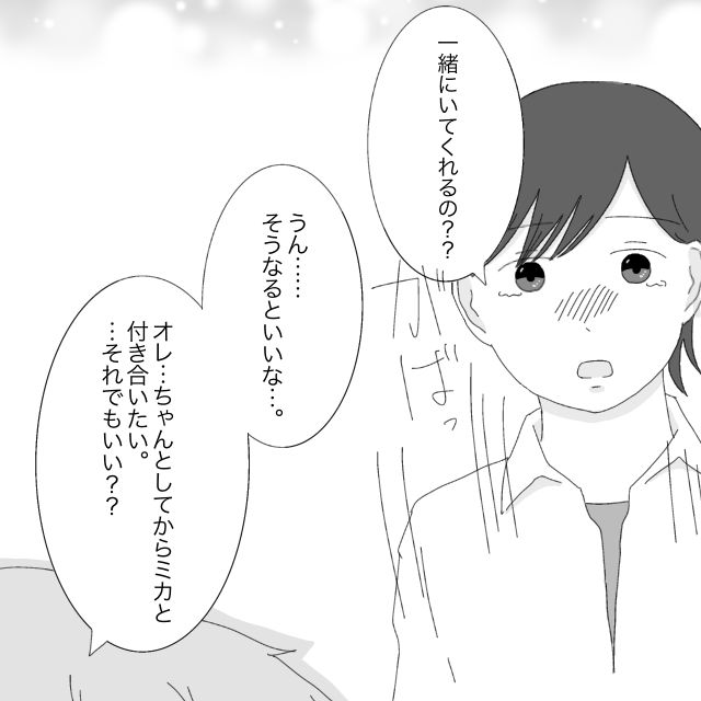 レンの言葉に、私は勢い良くうつむいていた顔を上げ、「一緒にいてくれるの?」と言いました。「オレ、ちゃんとしてからミカと付き合いたい・・・それでもいい?」いつになく真剣な眼差しに、私の目には涙が浮かびます。