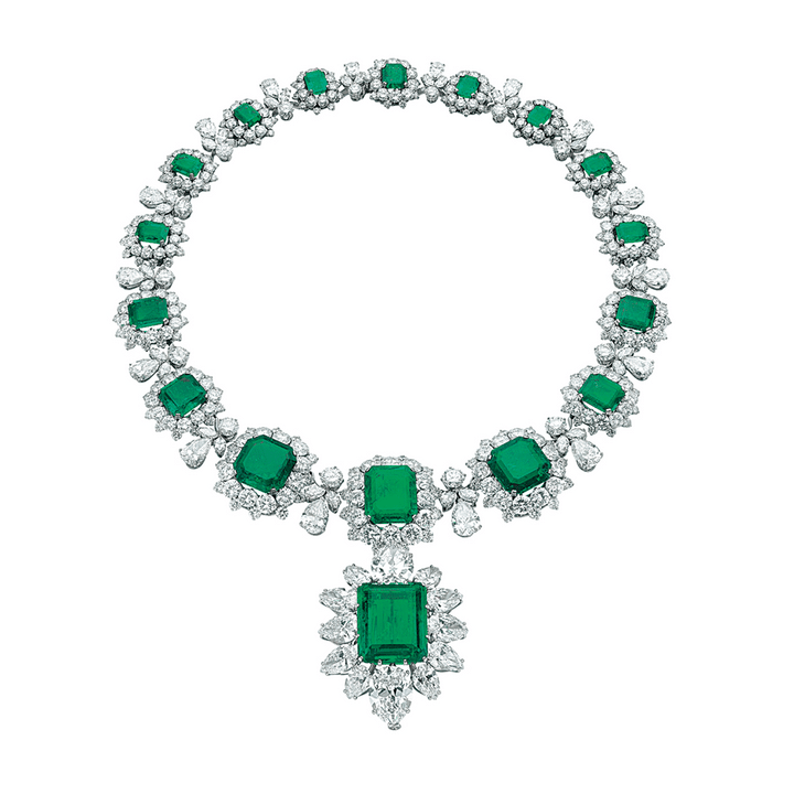 エリザベス・テイラーとリチャード・バートンの愛の物語を伝えるエメラルドネックレス(1960年代製)。ペンダントトップは婚約の際にバートンがプレゼントしたブローチで、後日、結婚の記念にネックレスが贈られました。このジュエリーは結婚式やアカデミー賞の受賞式などで着用され、テイラーの人生を華やかに彩ったことで知られています。