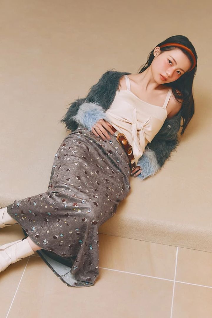 レザーベルト 7,480円/MOUSSY(バロックジャパンリミテッド)ベロアスカート 13,200円/31 Sons de mode(ダブルエー)ニットカーディガン 24,200円/マミタス(ビームス公式オンラインショップ)ニットビスチエ 5,390円/dazzlin カチューシャ 29,700円/Jennifer Behr(ザ ヘア バー トウキョウ)ブーツ 29,700円/ダイアナ(ダイアナ 銀座本店)