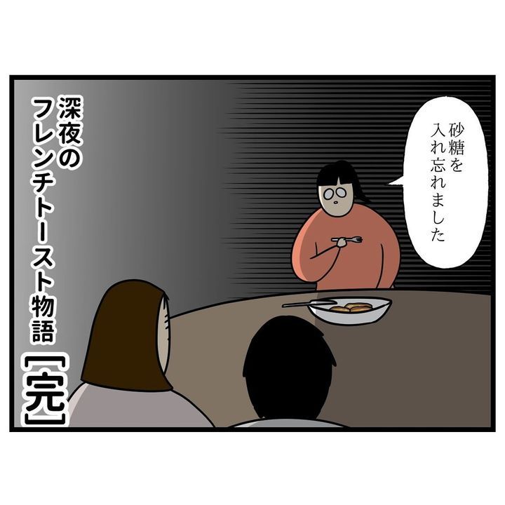 投稿元のコメント欄には、「深夜のフレンチトーストってなんかいいですね」「すごく美味しそうなのに!!砂糖入れ忘れるなんてすごく残念」「爆笑しました」といった声が寄せられていました。ノンノさん一家の何気ない日常のワンシーンに、心がほっこりしました!