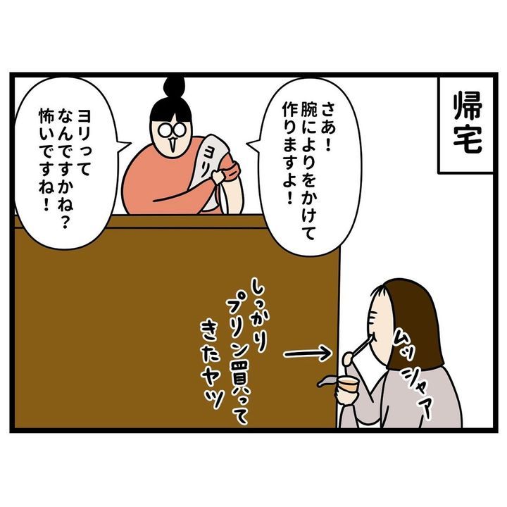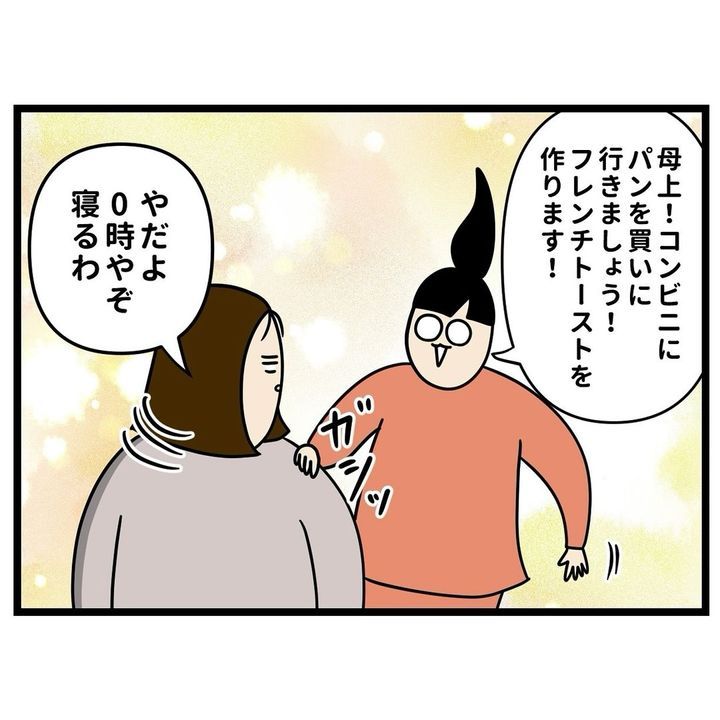 深夜に、どうしてもフレンチトーストが食べたくなったこめ美ちゃん。ノンノさんとカバさんを引き連れてコンビニに食パンを買いに行き、自宅で調理しますが、肝心の砂糖を入れ忘れてしまったのでした。