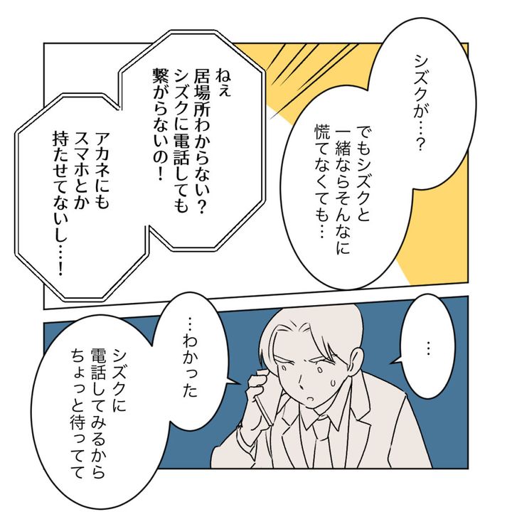 「シズクと一緒ならそんなに慌てなくても・・・」妻を信じるワタルとしては、娘の友達であるアカネちゃんがシズクと一緒なら安心のはずなのに、なぜカエデがここまで慌てるのかピンとこないのです。とにかく必死でシズクの居場所を知りたがるカエデにただならぬ空気を感じたワタルは、シズクに連絡することにして一旦カエデからの電話を切りました。