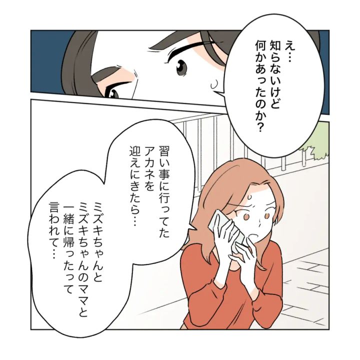 「え、知らないけど何かあったのか?」カエデのあまりの慌てように心配になるワタルです。シズクは「パパが早く帰って来た」とミズキに言っていましたが、ワタルはそんな連絡はしていなかったのです。「習い事に行ってたアカネを迎えにきたら・・・ミズキちゃんとミズキちゃんのママと一緒に帰ったって言われて」と焦っているカエデが、アカネちゃんの待つレストランにもう着いているというのもシズクの嘘でした。アカネちゃんは、誰も来ないレストランにひとり残されてしまったのです。