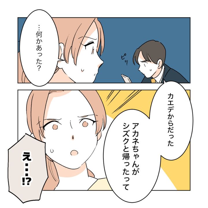 カエデからの電話を切ったワタルの様子と「アカネちゃんがシズクと帰った」と聞いてサクラは青ざめました。サクラはずっとシズクのことを疑っていて、同窓会への出席時にはショウマと一緒に行ってもらい、ミズキの誕生日に呼ばれた時にはカエデも一緒に行くように助言するほど、カエデのこともアカネのことも心配し続けていました。