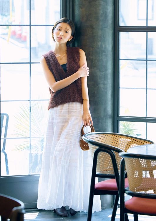 ベスト¥5,940/CITEN(ユナイテッドアローズ) 中に着たキャミソール¥6,930/AKTE スカート¥36,300/カデュネ イヤリング¥2,640/アネモネ(サンポークリエイト) パールネックレス¥20,900/チビ・ジュエルズ(チビジュエルズ・ジャパン) チェーンネックレス¥30,800/フェルセラ(ズットホリック)  バングル¥24,200/Jouete バッグ¥12,900/CHARLES & KEITH JAPAN ブーツ¥24,200/レメ(セムインターナショナル)