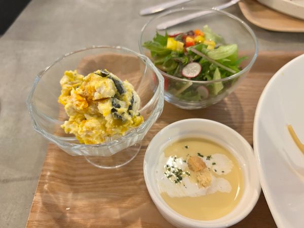 セットのサラダやかぼちゃサラダ、コーンスープもひとつひとつ丁寧に作られており、彩りも豊かで見た目にも大満足。ランチタイムが一気に華やぎます♪