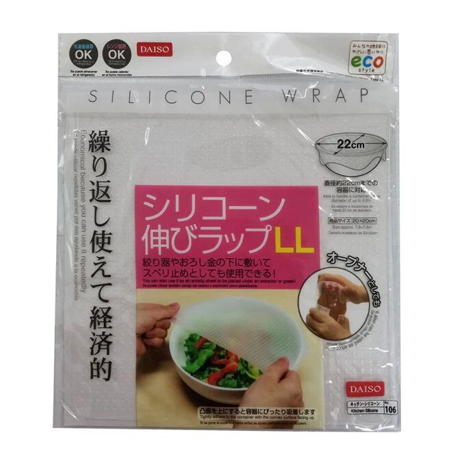 ダイソーの「シリコーン伸びラップ(LLなど)」は、20×20cmほどのサイズで、直径約22cmまでの容器に対応する製品が公式で出ています。
