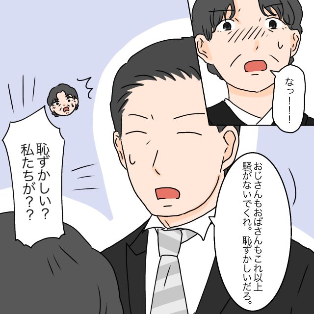 「なっ!!!」義母が言葉に詰まると、「おじさんもおばさんも、これ以上騒がないでくれ。恥ずかしいだろ」セイジさんの言葉に、「恥ずかしい?私たちが??」と辺りに構わず義母が叫びました。