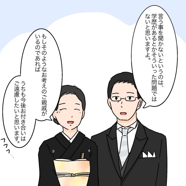 「言う事を聞かないというのは、学歴があるとかそういった問題ではないと思いますよ」「もしそのようなお考えのご親戚がいるのであれば、うちも今後お付き合いはご遠慮したいと思います」と微笑みながら言うミウさんのご両親に、