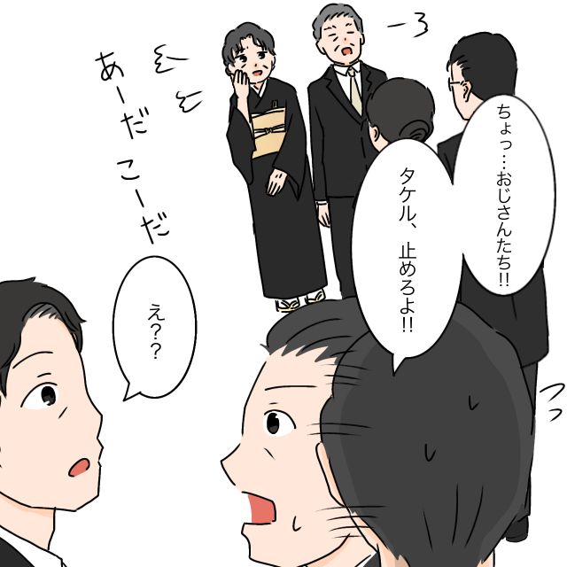 それを見て驚いたセイジさんが、「ちょっ・・おじさんたち!!タケル、止めろよ!!」と言うも、「え??」と相変わらずキョトンとしているだけのタケル。