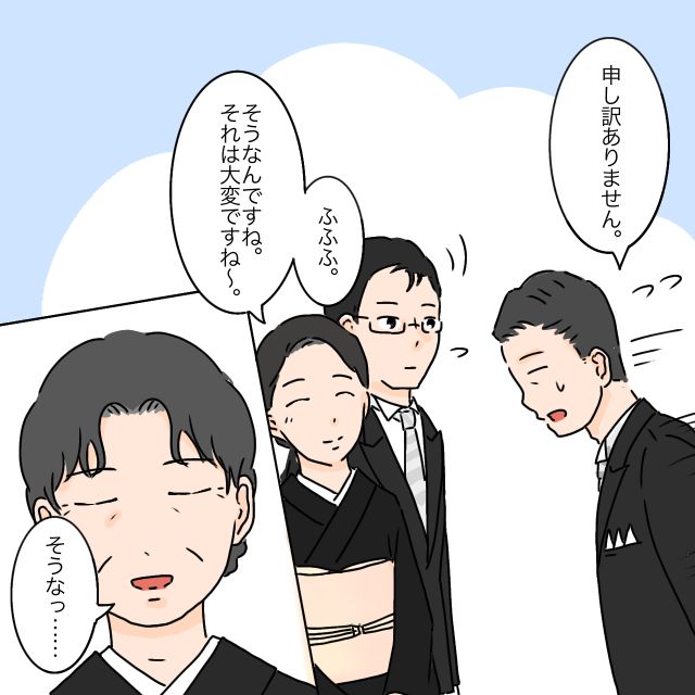 「申し訳ありません」セイジさんが慌てて謝ると、「ふふふ。そうなんですね。それは大変ですね~」と優しくミウさんのお母さんが言うと、「そうなっ・・」とまだ話を続けようとする義母。