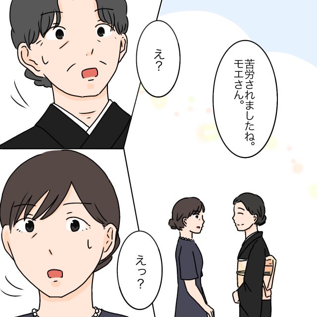 でも、ミウさんのお母さんは、「苦労されましたね。モエさん」と私に話しかけ、「え?」「えっ?」と私も義母も驚きました。