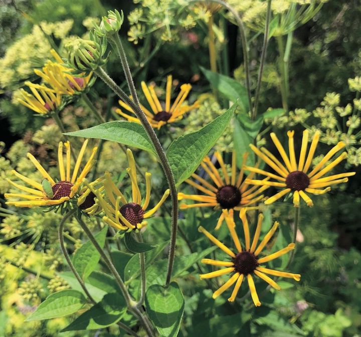 以前、オランダの庭で一目ぼれしたルドベキア ‘ヘンリーアイラーズ’の3号ポットを園芸店で発見。黄色の花が咲くルドベキアに合わせ、フェンネルの花と原種系チューリップも黄色に。