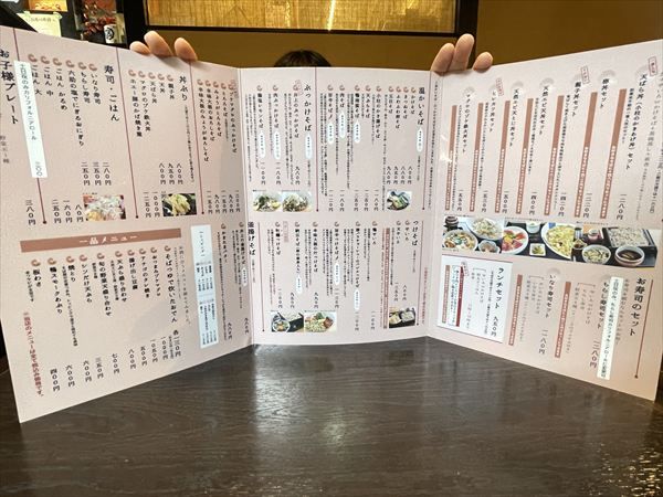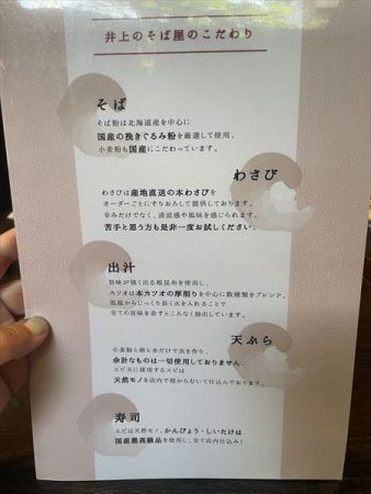 『井上のそば屋』のこだわりが記載されています。国産のそば粉はもちろん、わさびや出汁、天ぷらや寿司にわたり徹底したこだわり。これを見て筆者は衝撃をうけました。 すりたて本ワサビや天然エビなど、ここまでこだわったお店は少ないですし、あっても価格が手ごろではなくなります。これだけこだわっているにも関わらず、誰でも訪れやすい価格に驚きと感謝です!