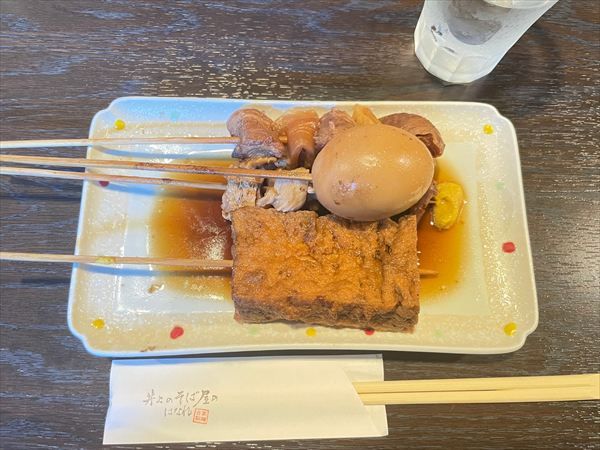 蕎麦がくるまでの間、おでんを楽しむことに。筆者は玉子と厚揚げ、牛すじにしました。