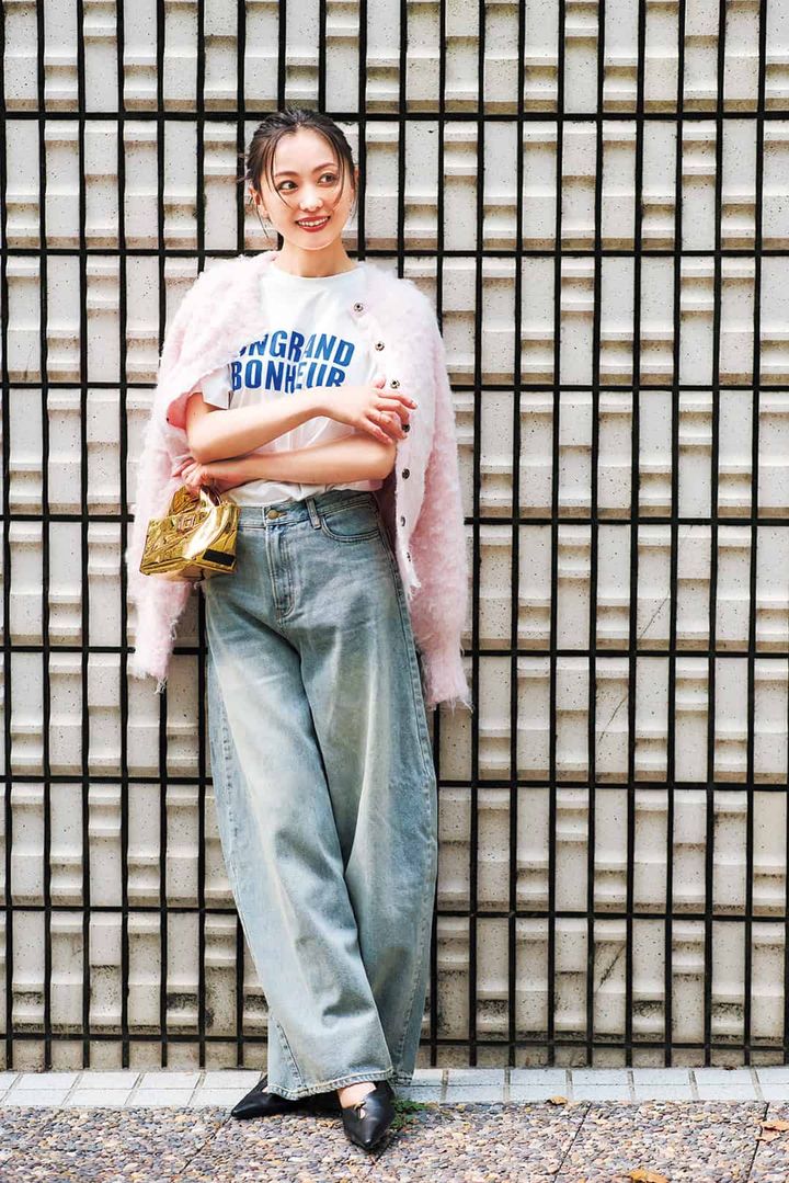 甘めのカーディガンにTシャツ、そしてデニムという秋の王道カジュアルコーデ。でも、デニムをバレルシルエットにするだけで一気に旬顔に!丸みシルエットが程よい抜け感を作り、ベーシックな組み合わせもぐっと新鮮に映ります。