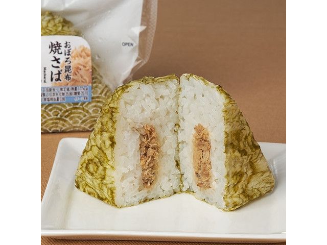 北陸地方でおなじみのおぼろ昆布シートで包んだ仕立てのおむすびです。脂のりと旨みの強い焼さばを包みました。