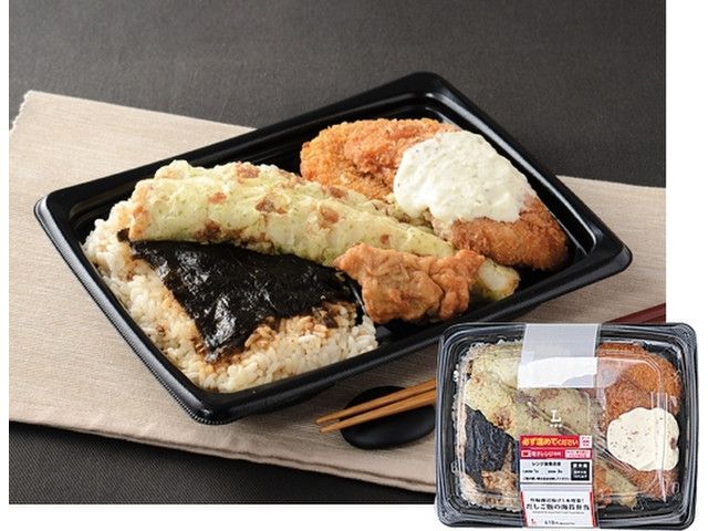 鰹、昆布、椎茸の3種類のだしで炊き上げたご飯におかか昆布と海苔を盛り付けました。ふっくらした食感の白身フライ、竹輪磯辺揚げ、カレーコロッケ、唐揚げを合わせた食べ応えのある海苔弁当です。