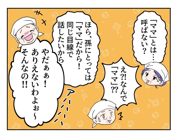 お義母さん、痛恨の極み……。パート先のみなさんが言うには、お嫁さんへの「ママ」呼びはかなり距離感が近くないと無理だとか。自分から見て本当の「ママ」ではない分、あだ名みたいなものだと感じるのですね。義理の親子という気を遣う関係性で、相手をあだ名で呼ぶとしたら……違和感を与えてしまっても仕方がありません。でも周りの人たちの言葉で後悔したお義母さん。ここからの行動が重要です!