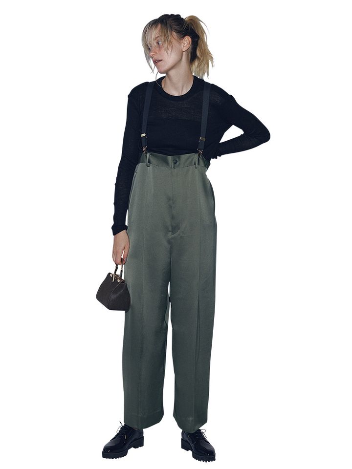 【POINT】光沢感のあるパンツで無骨な黒+カーキ配色をリュクスに好転。トップスはシンプルな黒にとどめて、深い股上とサスペンダーによる縦に伸びた印象を印象づけて。