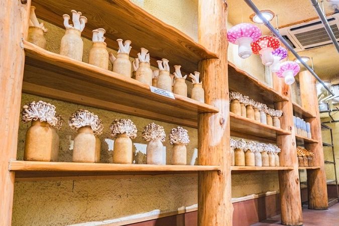 ずらりと並んだ生育中のポットから好きなきのこを選んでレジに持ち込み、会計後、もぎ取り体験ができます。