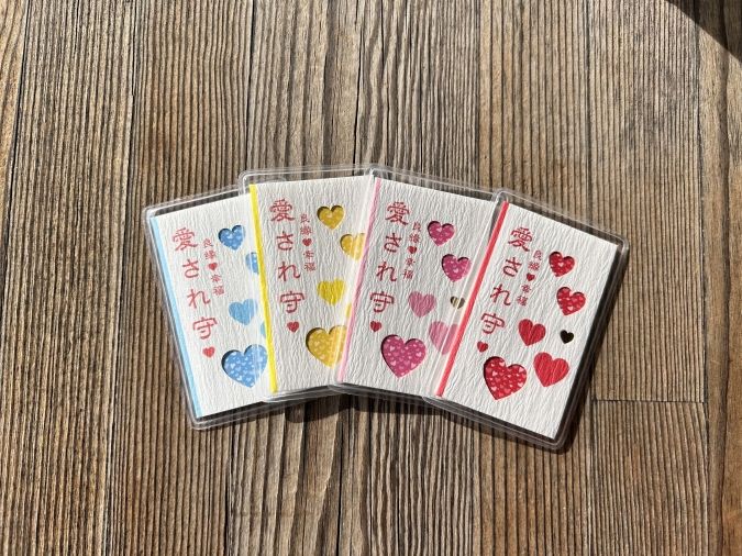 おみくじも、もちろんハート。『愛され守』(4種各800円)は赤、ピンク、黄色、青の4色。財布などに入れて持ち歩くと良いとか。