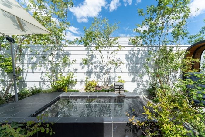 テーマは「森の中に佇む癒しの空間」。造園家の小西範揚氏が手がけたランドスケープは、木漏れ日がやさしく降り注ぎ、自然と建築の調和が見事です。