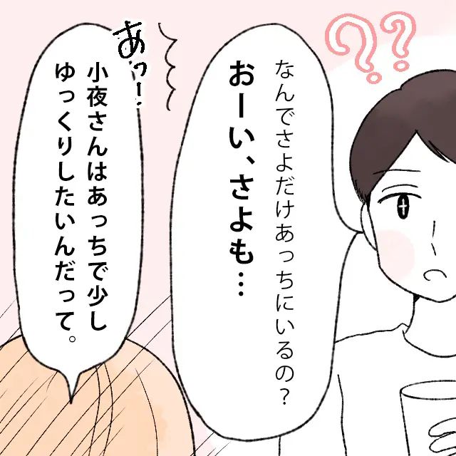 すると、私が席にいないのに気づいた夫が、「なんで小夜だけあっちにいるの?おーい、小夜も・・」と声をかけようとすると、「あっ!小夜さんはあっちで少しゆっくりしたいんだって」と義母が口を出しました。