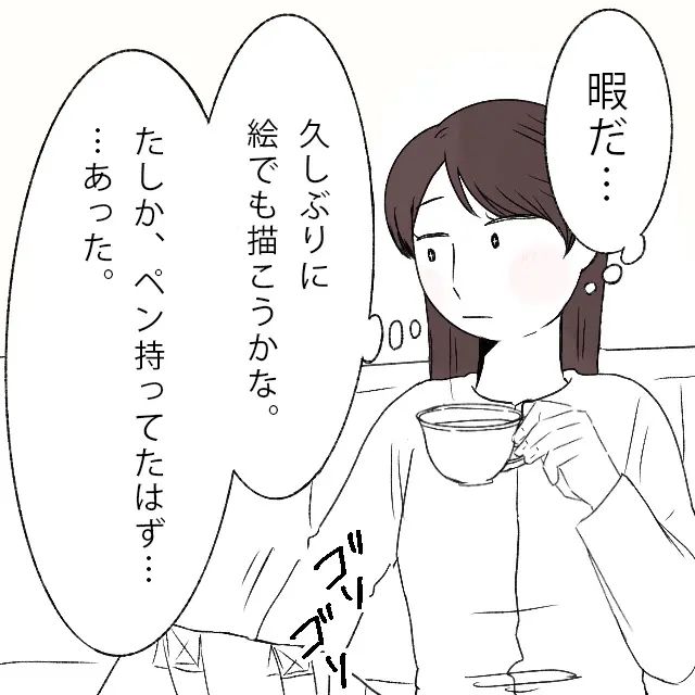 「暇だ・・久しぶりに絵でも描こうかな。たしかペン持ってたはず・・あった」とカバンに入れていたペンと紙を取り出しました。