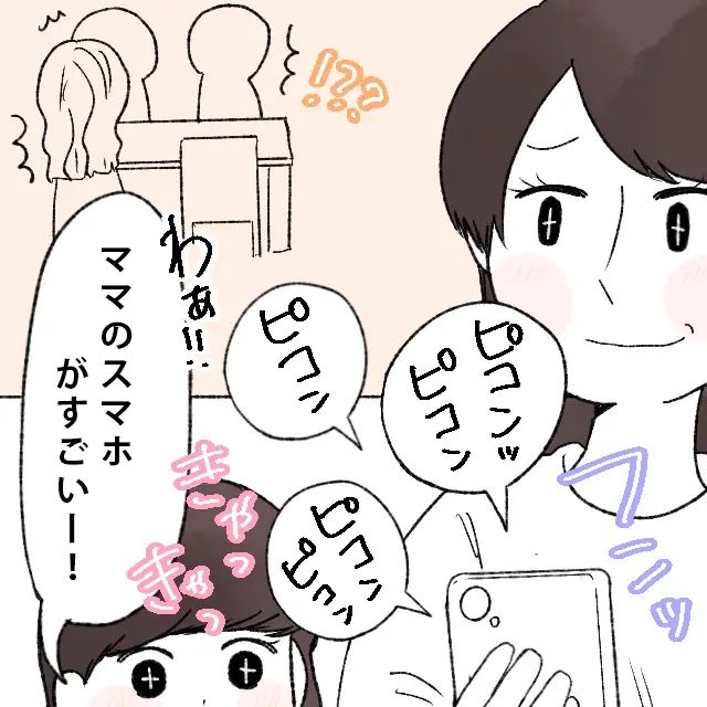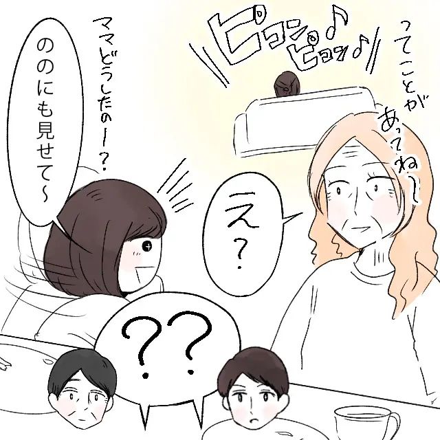 すると、ピコン!ピコンピコン!とスマホの音がどんどん鳴り出して、「え?」義母が驚くと、「ママどうしたのー?ののにも見せて~」とののが乗り出してそう言うのを聞いて、夫も義父も「??」と不思議そう。