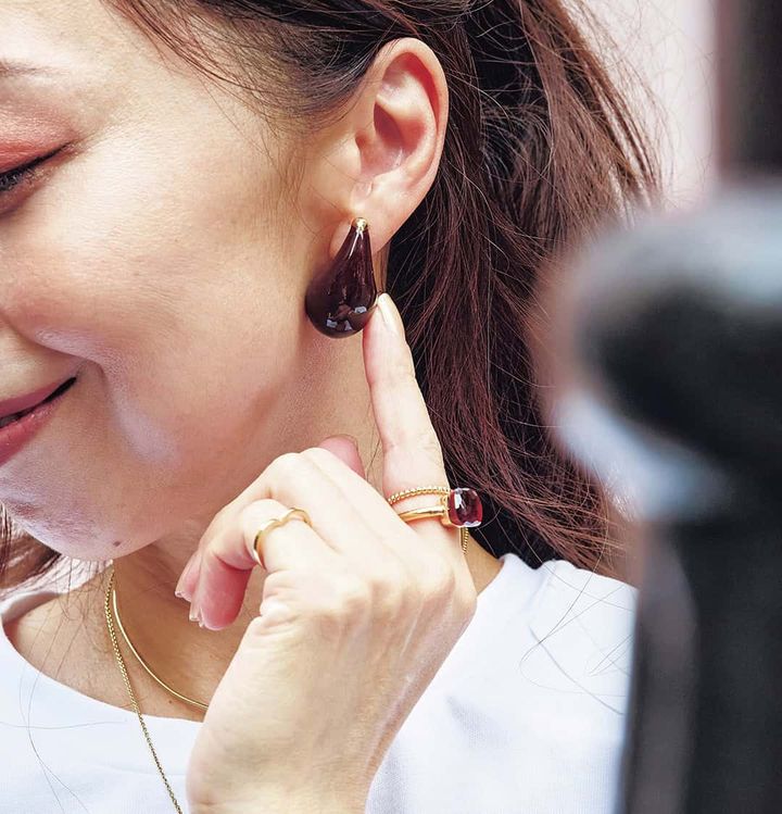 「ボルドーのボッテガのピアスはベアデニムワンピと合わせて、新鮮な女子会スタイルに」