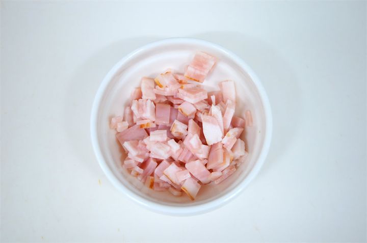 1. ベーコンは0.5cm角に切り、電子レンジ500Wで30~50秒ほど加熱する。