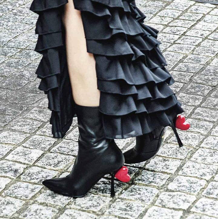 「一目惚れしたモスキーノのハートモチーフ付きブーツの遊び心と、色で秋を演出。スリットスカートで存在感をアピール」