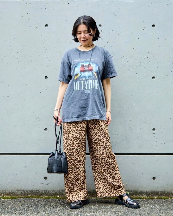 インパクトのある柄は、ラフなTシャツやシックなレザー小物でコーデを引き締めると◎。