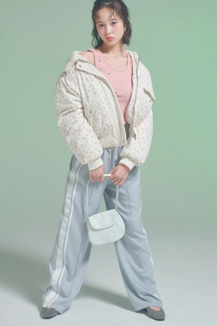 白フラワーパフジャケット 16,600円/BITTERCELLS(HANA KOREA)ピンクスタッズタンクトップ 8,800円/eimy istoire ルミネエスト新宿店 ブルーラインパンツ(リボンキャミトップスとセット)25,630円/Crayme イヤリング 9,900円/アビステ ミントグリーンバッグ 9,020円/mucu and ebony(HANA KOREA)パンプス 12,650円/ アルテミス by ダイアナ(アルテミス by ダイアナ アーバンドックららぽーと豊洲店)