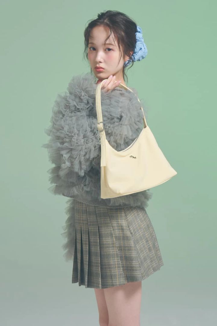 グレーチュールフリルニット 24,200円/HONEY MI HONEY チェックプリーツスカート 13,200円/MERCURYDUO ルミネエスト新宿店 ブルーヘアクリップ 550円/WEGO イエローバッグ 8,520円/mucu and ebony(HANA KOREA)