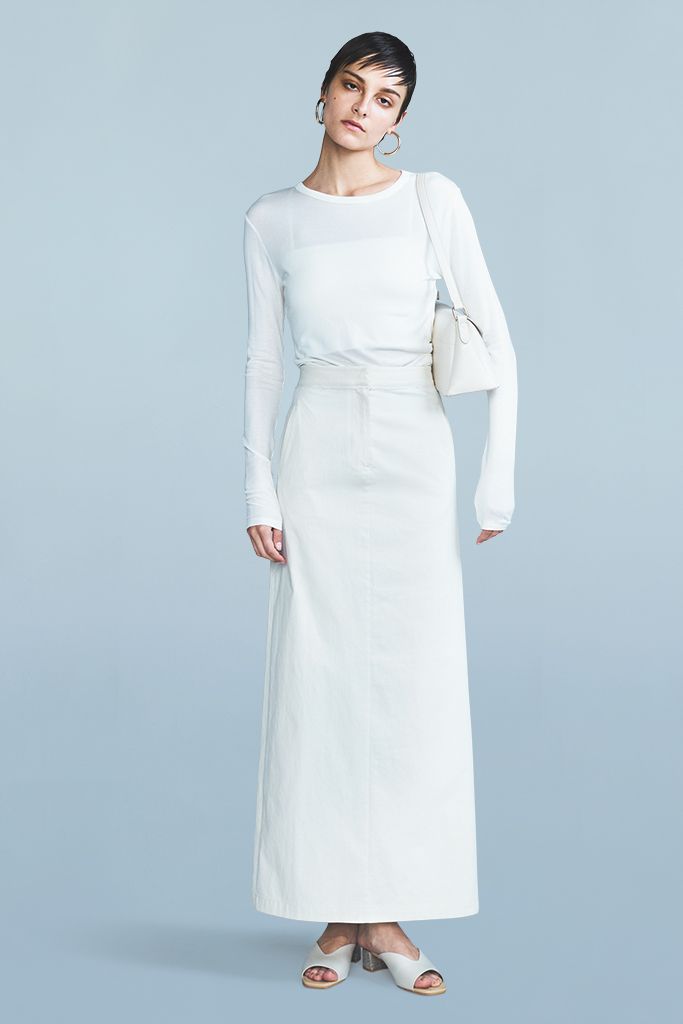 凹凸をつくるあしらいがなく、硬めの生地が体の厚みを打ち消して均整のとれた輪郭をメイク。繊細なセンターシームがひかえめなポイントに。透けが気になりにくい裏地つき。 白タイトスカート/KUME 白ロンT/アンヌーク
