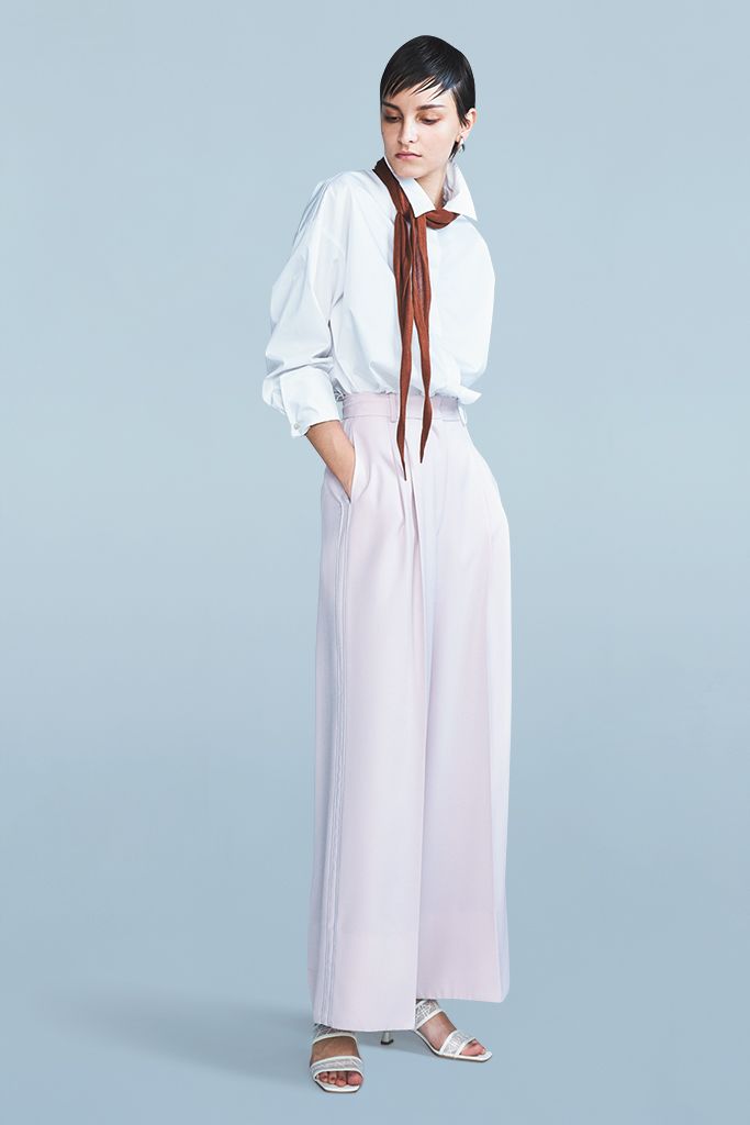 ラインに加え、2本のタックにセンタープレスと、美脚要素をつめ込んだ1本。パンツスーツを思わせる光沢のある質感がはかない色みをハンサムに引き寄せ。縦ラインのアクセントが加わることで、かなり広がったワイドでものっぺり見えを回避。 ピンクライン入りパンツ/SNIDEL 白シャツ/サヴィル サヴィ