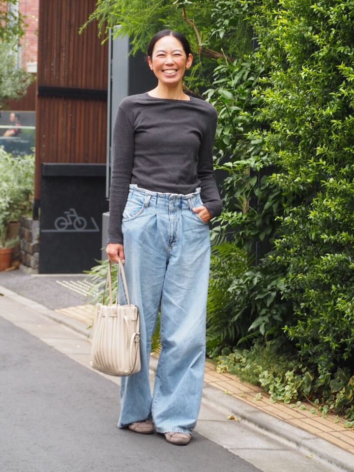 スタイルのよさをいかしたシンプルな着こなしで表参道を颯爽と歩くMさん。フィット感のあるチャコールグレーのカットソーとライトブルーのデニムのコントラストが、ほどよい抜け感を演出しています。サイズ展開が豊富な「ザラ」は、長身のMさんのおしゃれに欠かせない駆け込み寺のような存在なのだとか。