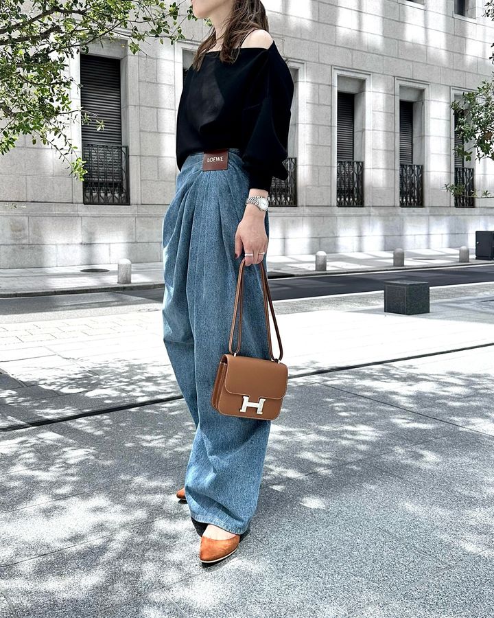 カジュアルなデニムスタイルながら、上質な素材感のトップスを選ぶことで、きれいめな印象をキープ。トップスをハイウエストのデニムにタックインし美バランスな着こなしに。シンプルな配色ながら、キャップ、バッグ、シューズをキャメル系の同系色で統一しているのがポイント。「黒トップス」×「デニム」コーデが、小物効果で秋らしく華やぎます。