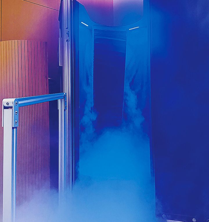クライオセラピーは運動後の回復手段としてアスリートも利用。この中に入って顔だけ出し、3分冷気を浴びる