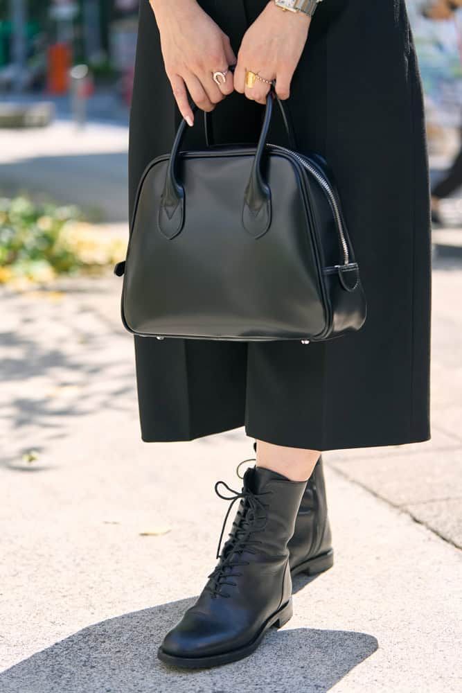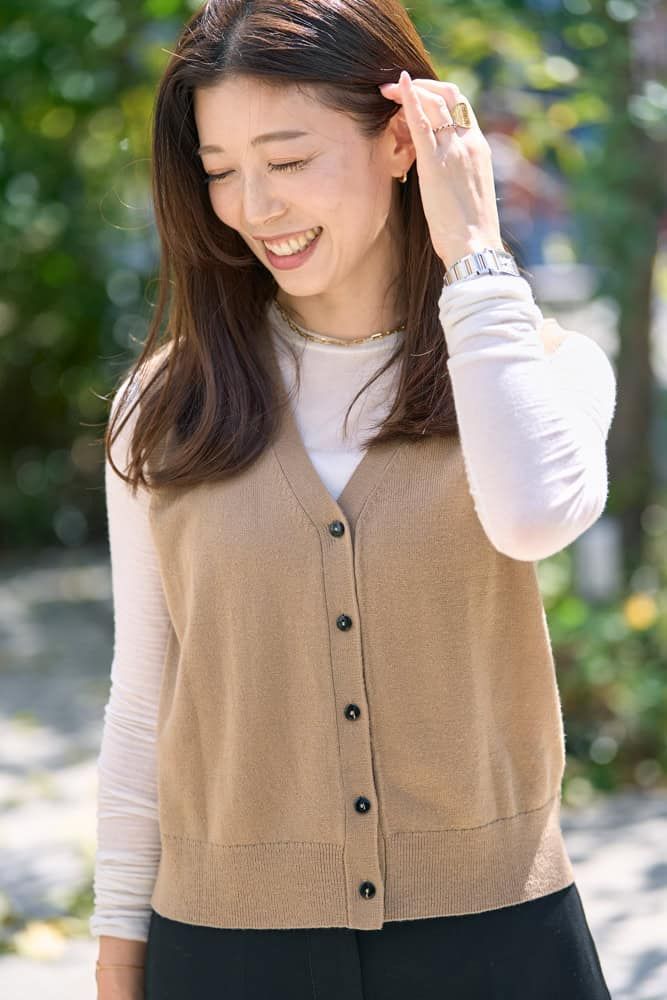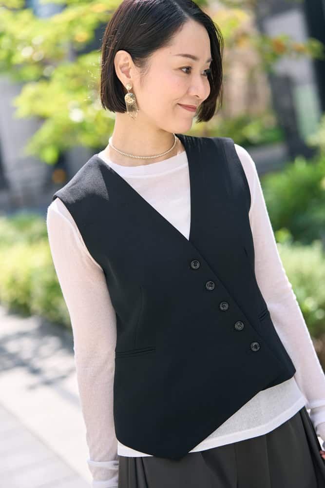 薄手でコンパクトなベストは、カットソーに重ねるだけで秋らしさを演出。このベストは薄手なのでコートのインにも着られ、秋から冬まで長く楽しめるところも気に入っています。ボトムスはミディ丈を選ぶことで足元に抜け感が生まれ、ブーツとも好相性。全体をIラインでまとめ、バッグとシューズを黒で統一すれば、スッキリと大人っぽくまとまり、スタイルアップも叶います。
