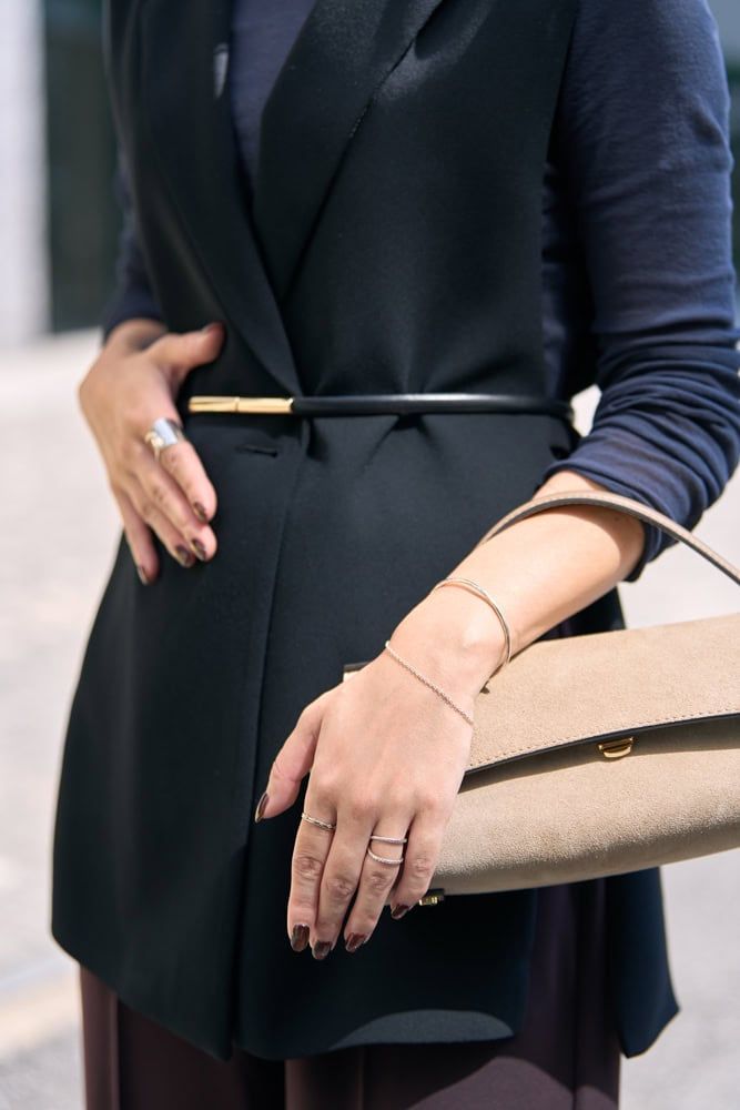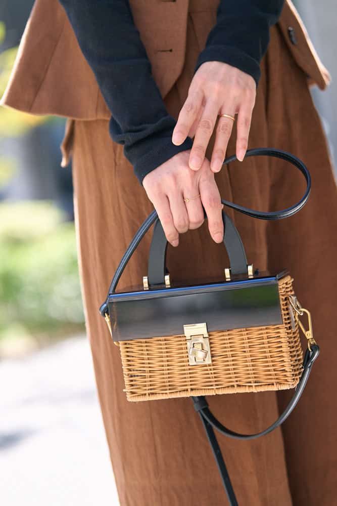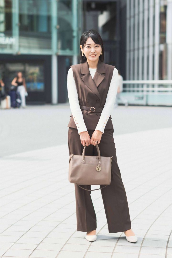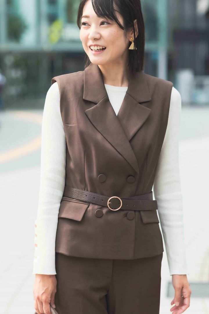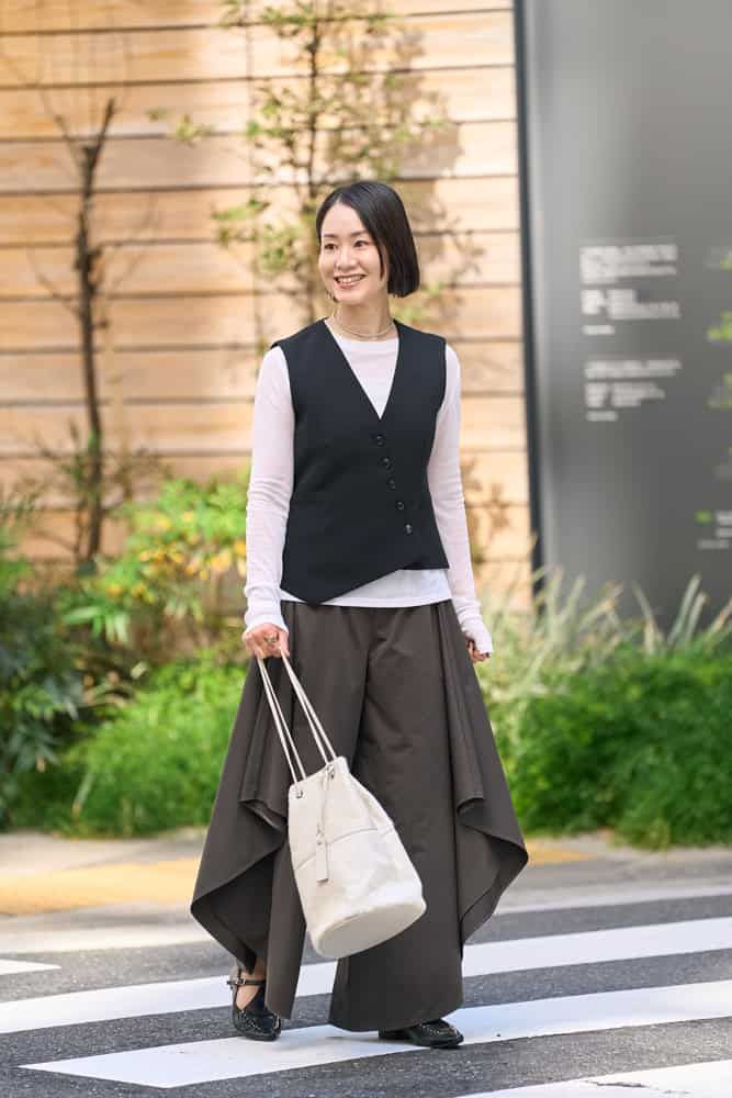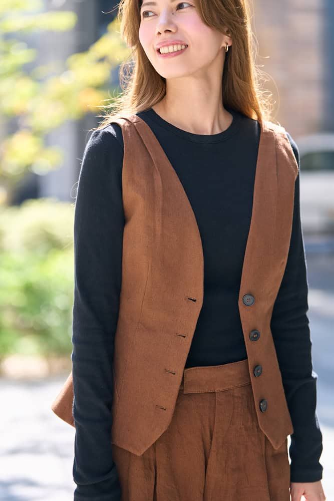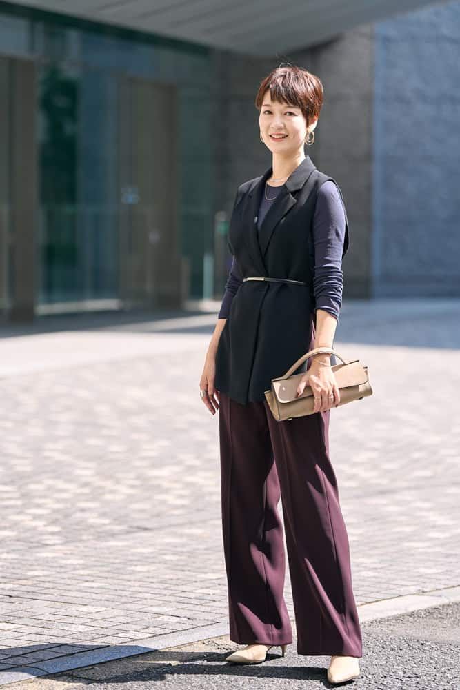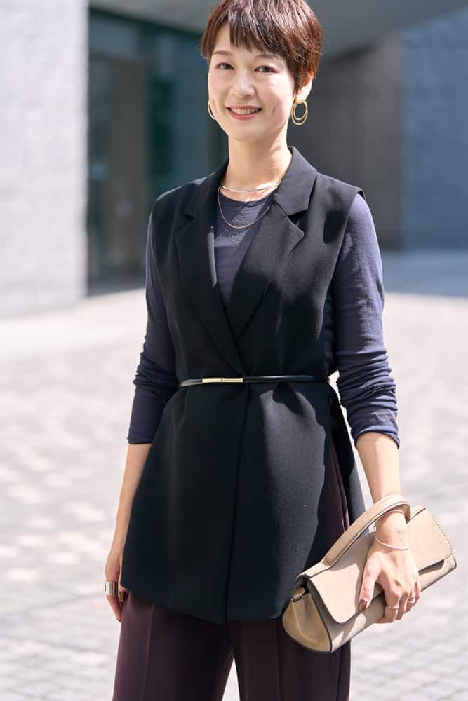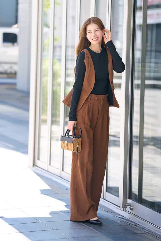毎年、秋になるとオールブラックになりがち。今季トレンドのブラウンは肌色にも馴染み、顔映えするので友人からも褒められるベストカラー。同色のジレとパンツのセットアップ風スタイルはクール見えしがちですが、肩幅が小さめなデザインなので華奢見えし、フロントの丸いカットが女性らしさをプラスしてくれます。フォーマル感が強いので軽やかなカゴバッグを合わせ、堅過ぎない印象に。