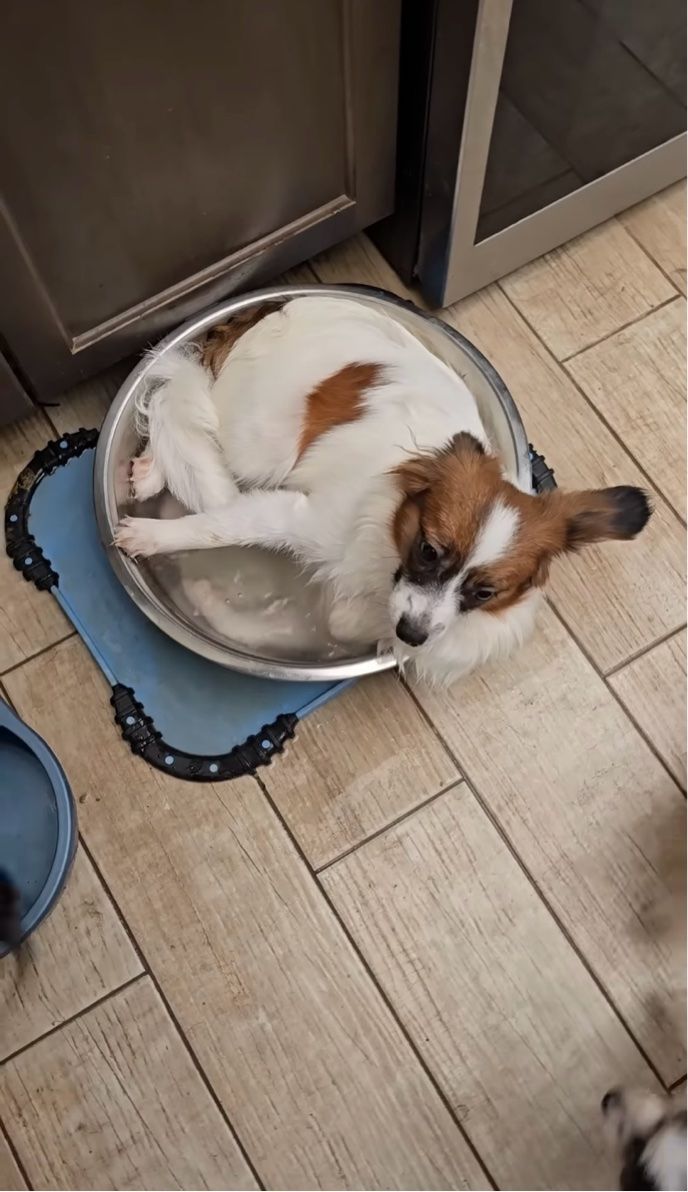 意外な場所で水遊びを楽しんでいた愛犬。 体を小さく丸めて浸かっているその場所は、お風呂でもプールでもありませんでした!