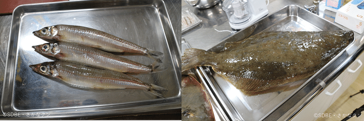 今回のワークショップでは、ABCスタイルの先生たちが、低利用魚のおいしい食べ方を紹介しました。料理したのは、普段あまり見かけないニギスやアカエイ、そしてヒラメです。